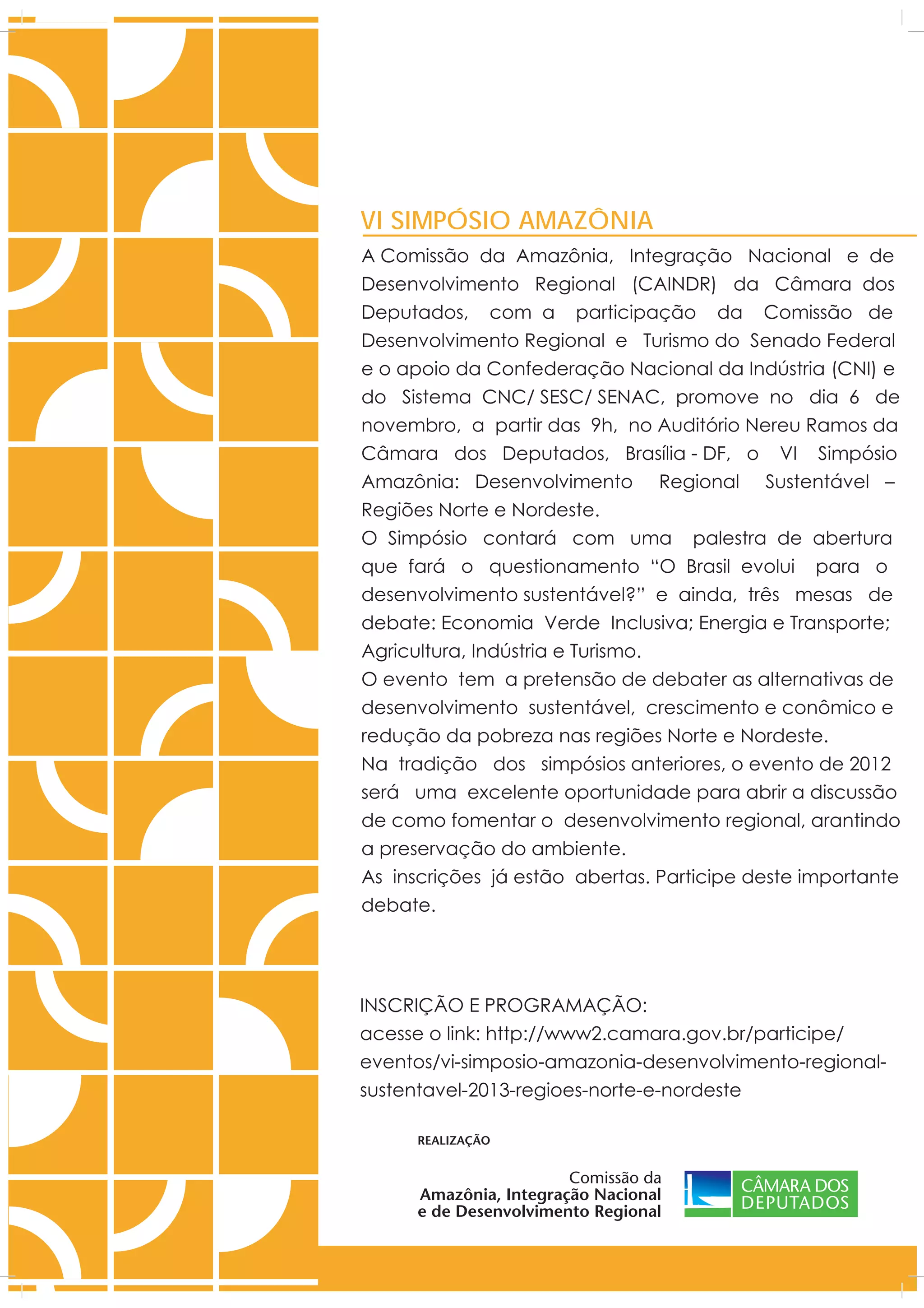O documento anuncia o VI Simpósio Amazônia, que irá debater alternativas de desenvolvimento sustentável e crescimento econômico nas regiões Norte e Nordeste do Brasil. O evento ocorrerá em 6 de novembro na Câmara dos Deputados e contará com palestras e mesas sobre economia verde inclusiva, energia, transporte, agricultura, indústria e turismo. O simpósio visa discutir como fomentar o desenvolvimento regional garantindo a preservação ambiental.