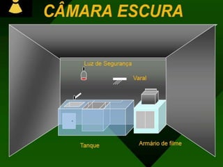 O documento fornece uma introdução à radiologia, descrevendo os principais conceitos como imagem radiográfica, filme radiográfico, écrans, processamento de imagens e câmara escura. Explica como os raios-X formam imagens latentes no filme e como o processamento as torna visíveis, além de detalhar a composição e função dos diferentes equipamentos utilizados.