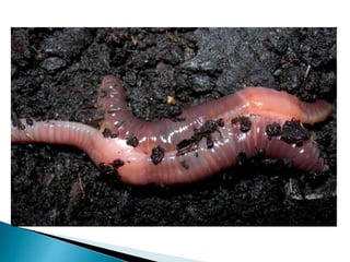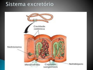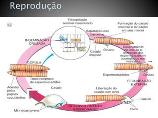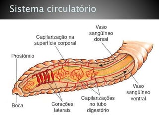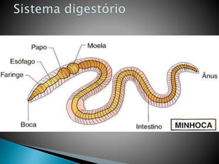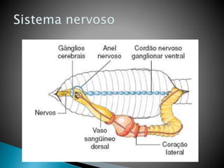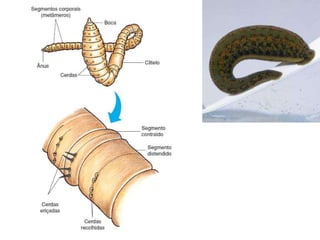 Os vermes segmentados possuem corpos segmentados com metâmeros separados por septos, cada um com estruturas nervosas e músculos. Apresentam simetria bilateral e cerdas que auxiliam na locomoção e trocas gasosas. Incluem minhocas terrestres, poliquetos aquáticos e sanguessugas.