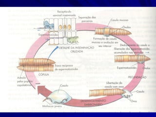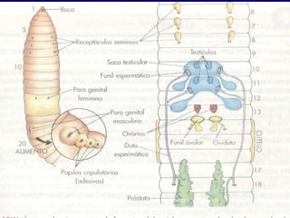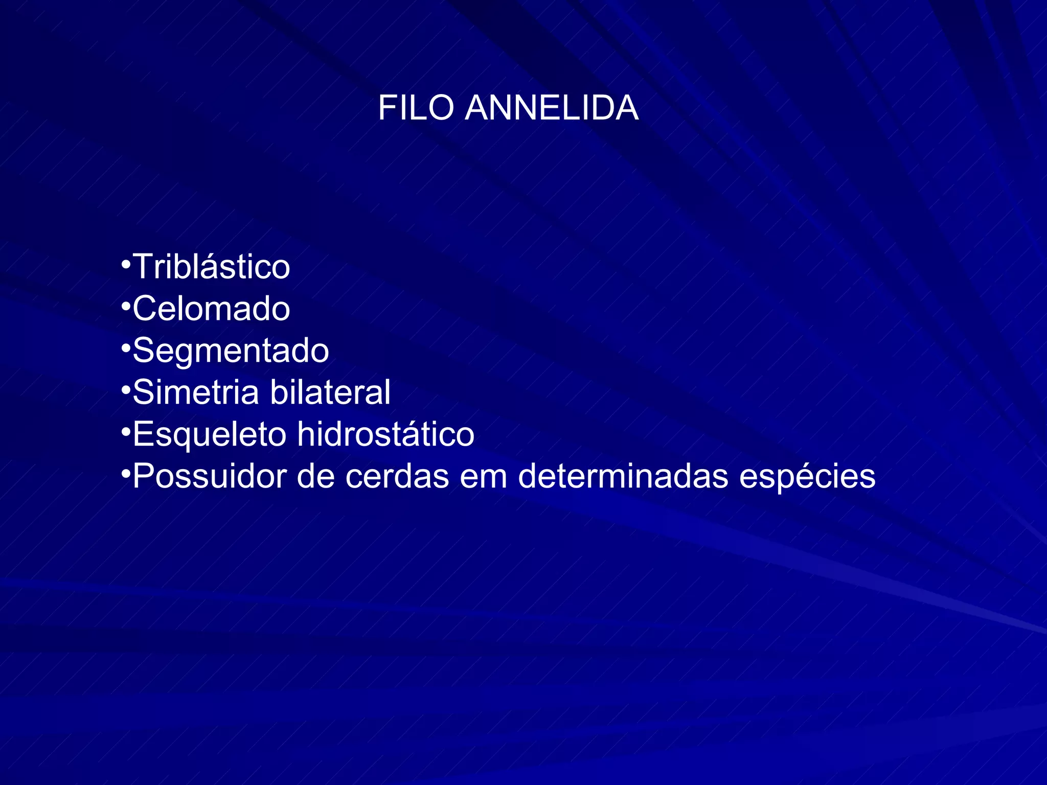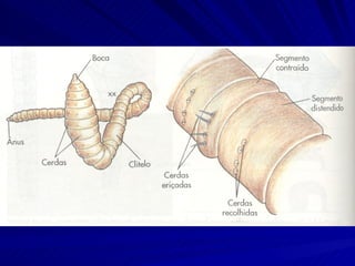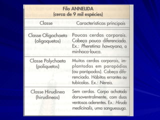O documento descreve as características de filos de animais anelídeos. Estes filos incluem Polychaeta, Hirudinea e Oligochaeta, que são animais segmentados, bilaterais simétricos e com esqueleto hidrostático. Alguns possuem cerdas e as larvas desses animais passam por estágios como a larva trocófora durante o desenvolvimento.