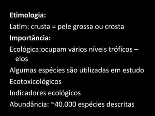 O documento descreve as principais características do filo Arthropoda subfilo Crustacea. Apresenta informações sobre a importância ecológica e econômica dos crustáceos, suas características morfológicas gerais como a presença de dois pares de antenas e apêndices diversificados. Também aborda aspectos da reprodução, desenvolvimento e sistemas como o excretor e nervoso.