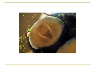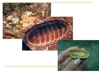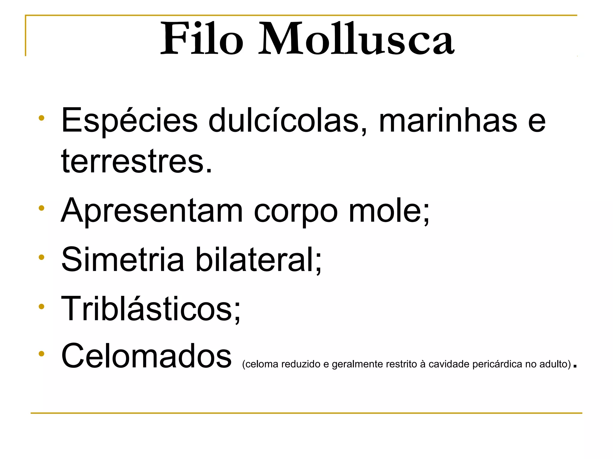 O documento descreve as principais características do filo Mollusca, incluindo seu corpo mole, simetria bilateral e presença de concha. O texto detalha as subclasses Aplacophora, Polyplacophora, Monoplacophora e Gastropoda, focando em suas estruturas anatômicas e hábitats.
