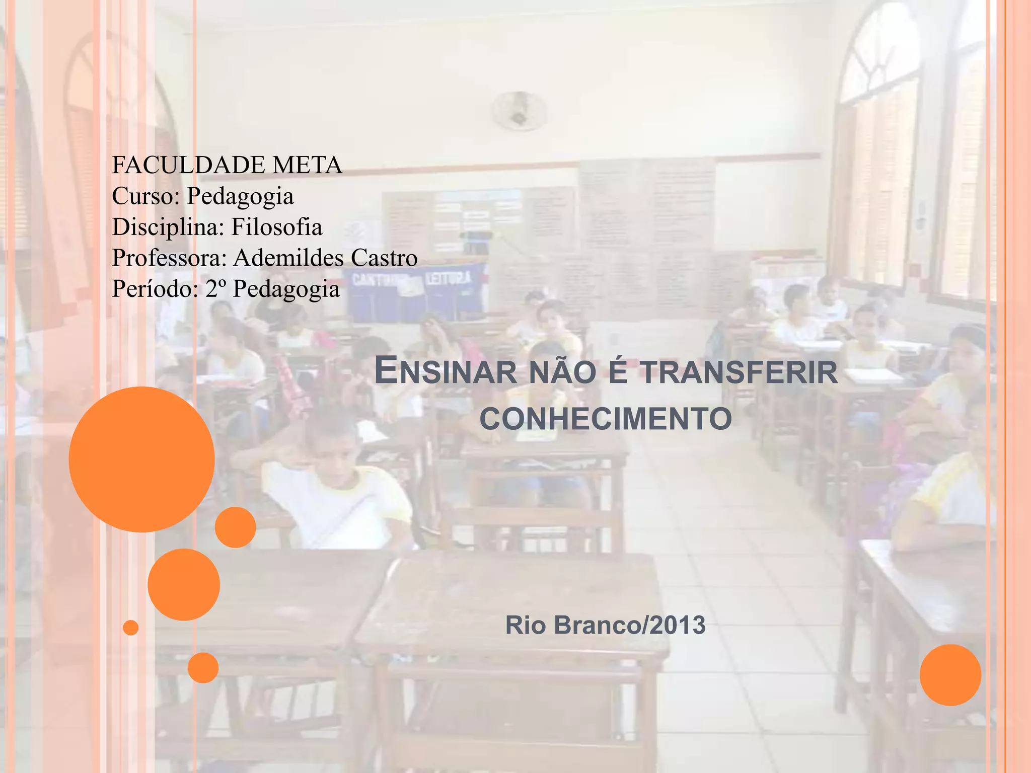 O documento discute como ensinar não é simplesmente transferir conhecimento, mas sim criar possibilidades para a construção do conhecimento pelos estudantes de forma autônoma e cooperativa, reconhecendo a natureza inacabada do ser humano.