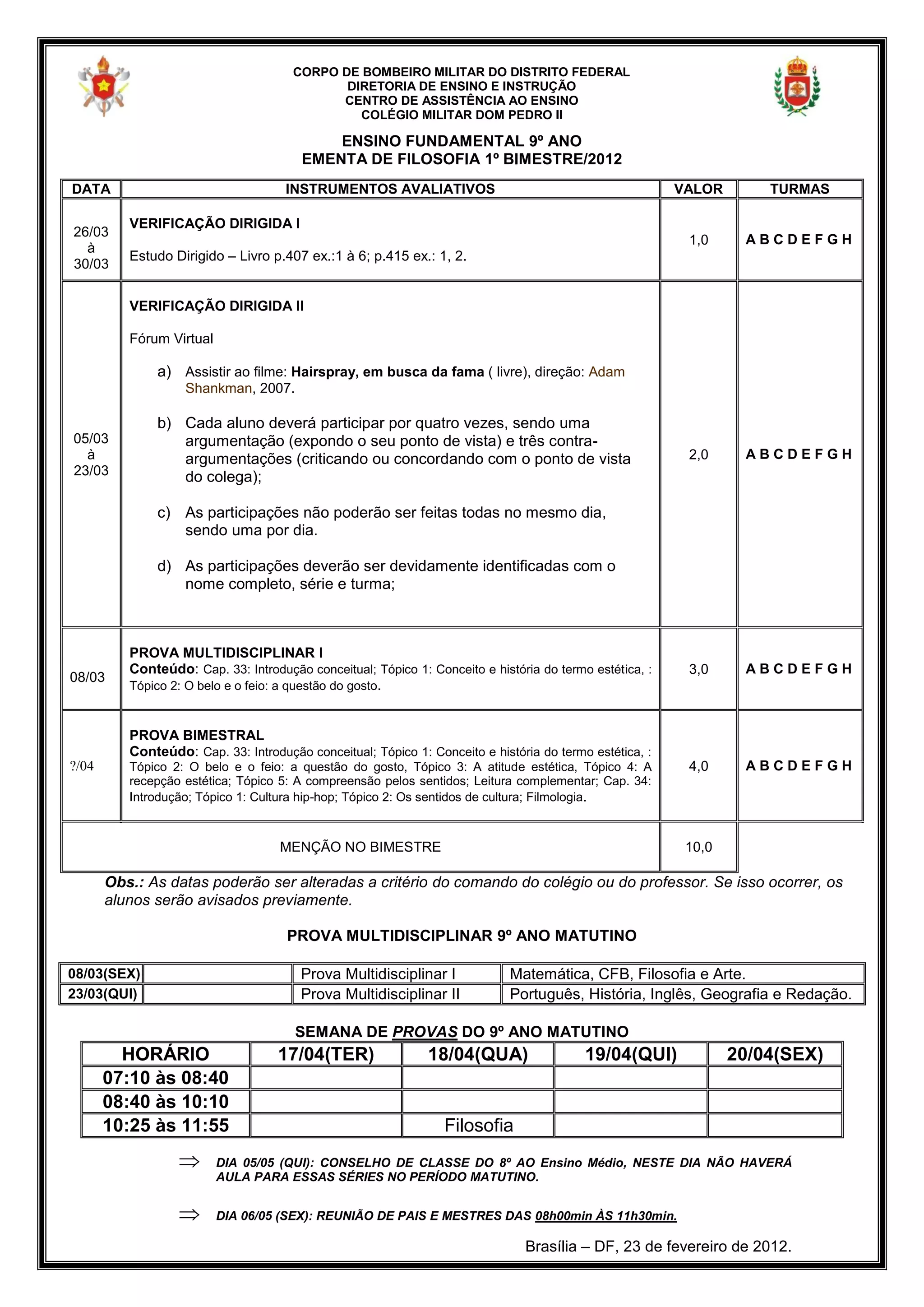 Este documento apresenta o plano de ensino de Filosofia para o 1o bimestre do 9o ano do Colégio Militar Dom Pedro II. Inclui instrumentos avaliativos como verificações dirigidas, fórum virtual, provas multidisciplinares e bimestral sobre os tópicos de estética e cultura. Também lista o cronograma de provas do 9o ano matutino para o período.