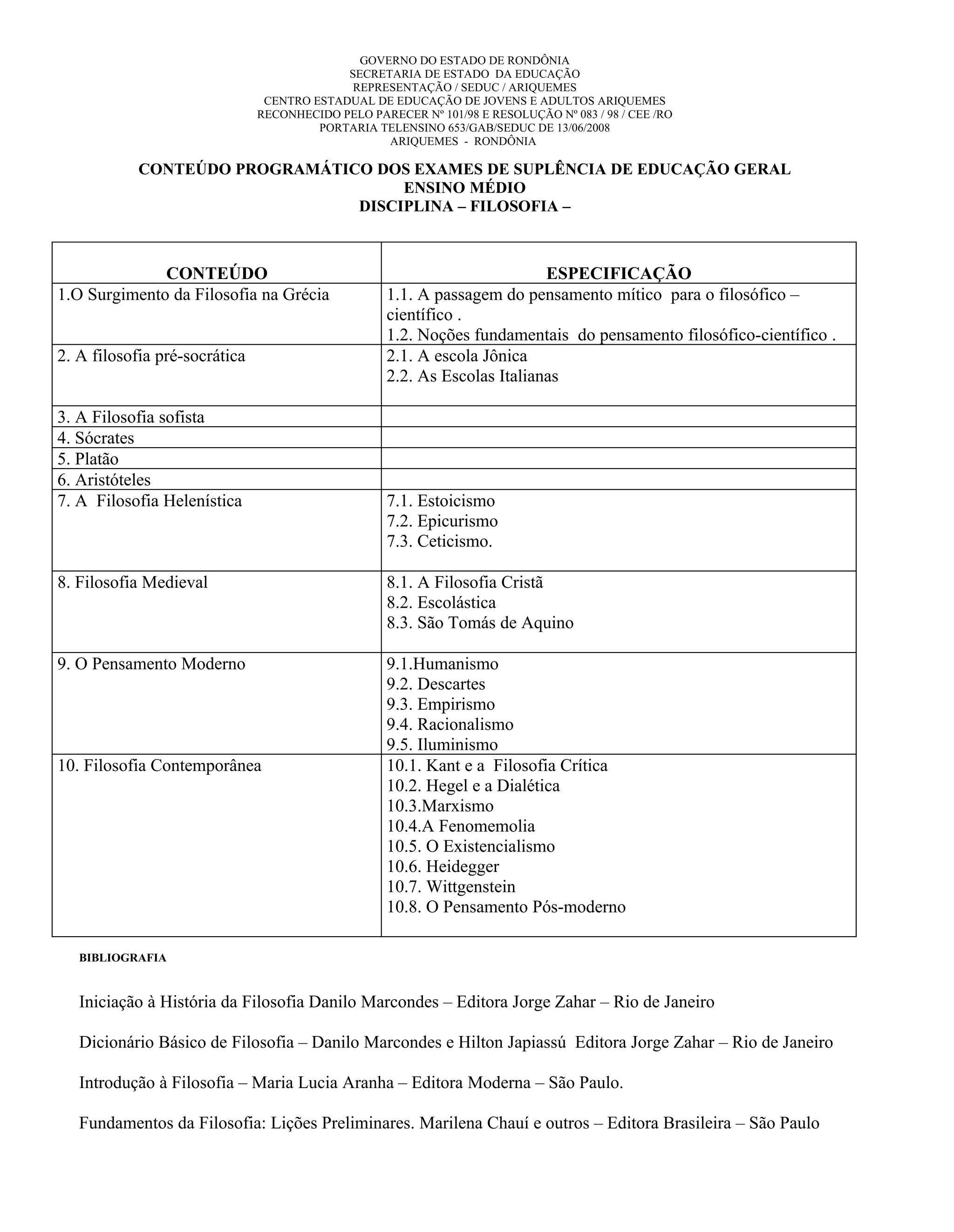O documento apresenta o conteúdo programático de uma disciplina de Filosofia para exames de suplência de Ensino Médio, dividido em 10 tópicos que abordam os principais temas e pensadores da história da Filosofia, desde a Grécia Antiga até a Filosofia Contemporânea, fornecendo também uma breve bibliografia de referência.