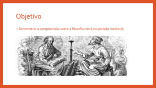 O documento discute a filosofia cristã no período medieval, definindo a filosofia patrística e escolástica. Apresenta pensadores como Justino, Tertuliano e Agostinho, que contribuíram para a filosofia patrística, e Tomás de Aquino, Pedro Abelardo e Guilherme de Ockham, importantes na filosofia escolástica. O objetivo é demonstrar a compreensão da filosofia cristã nesse período e como conciliou fé e razão.