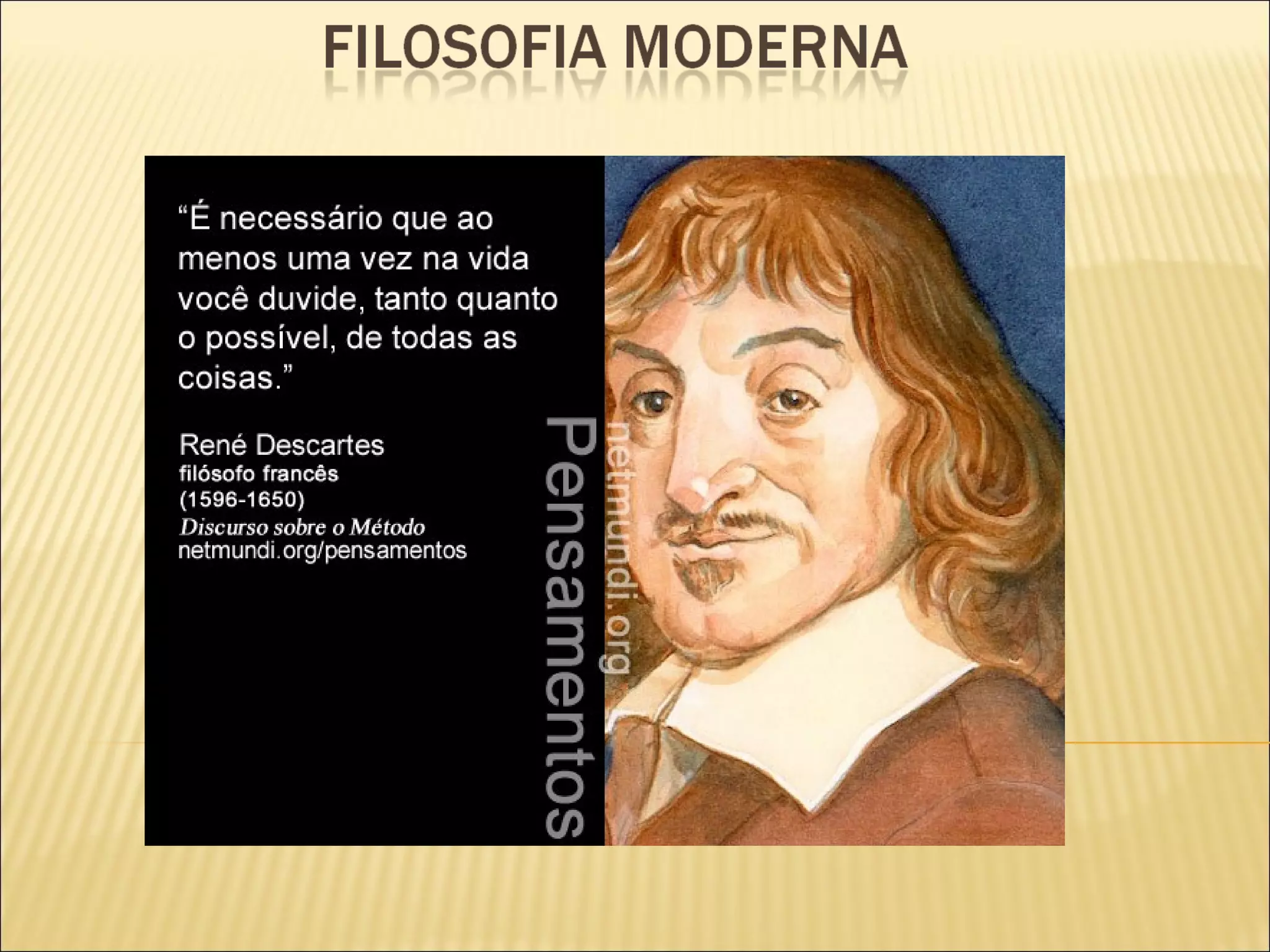 O documento discute a filosofia moderna, caracterizando-a como o período entre os séculos XV e XX e destacando suas principais escolas e características. A modernidade rompeu com a tradição ao valorizar o novo e a individualidade e rejeitar a autoridade da Igreja. O humanismo colocou o ser humano no centro e levou ao racionalismo. A Reforma Protestante dividiu a Igreja Católica e permitiu maior acesso à Bíblia.