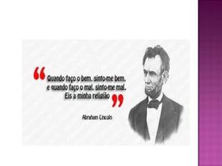 Abraham Lincoln nasceu em 1809 no Kentucky e se tornou o 16o presidente dos Estados Unidos em 1860, liderando o país durante a Guerra Civil Americana e promulgando a Emancipação dos Escravos. Ele teve uma infância difícil e trabalhou em vários empregos antes de estudar direito e se tornar advogado, defendendo os pobres. Lincoln foi assassinado em 1865, mas é lembrado por fortalecer a união e modernizar a economia dos EUA.