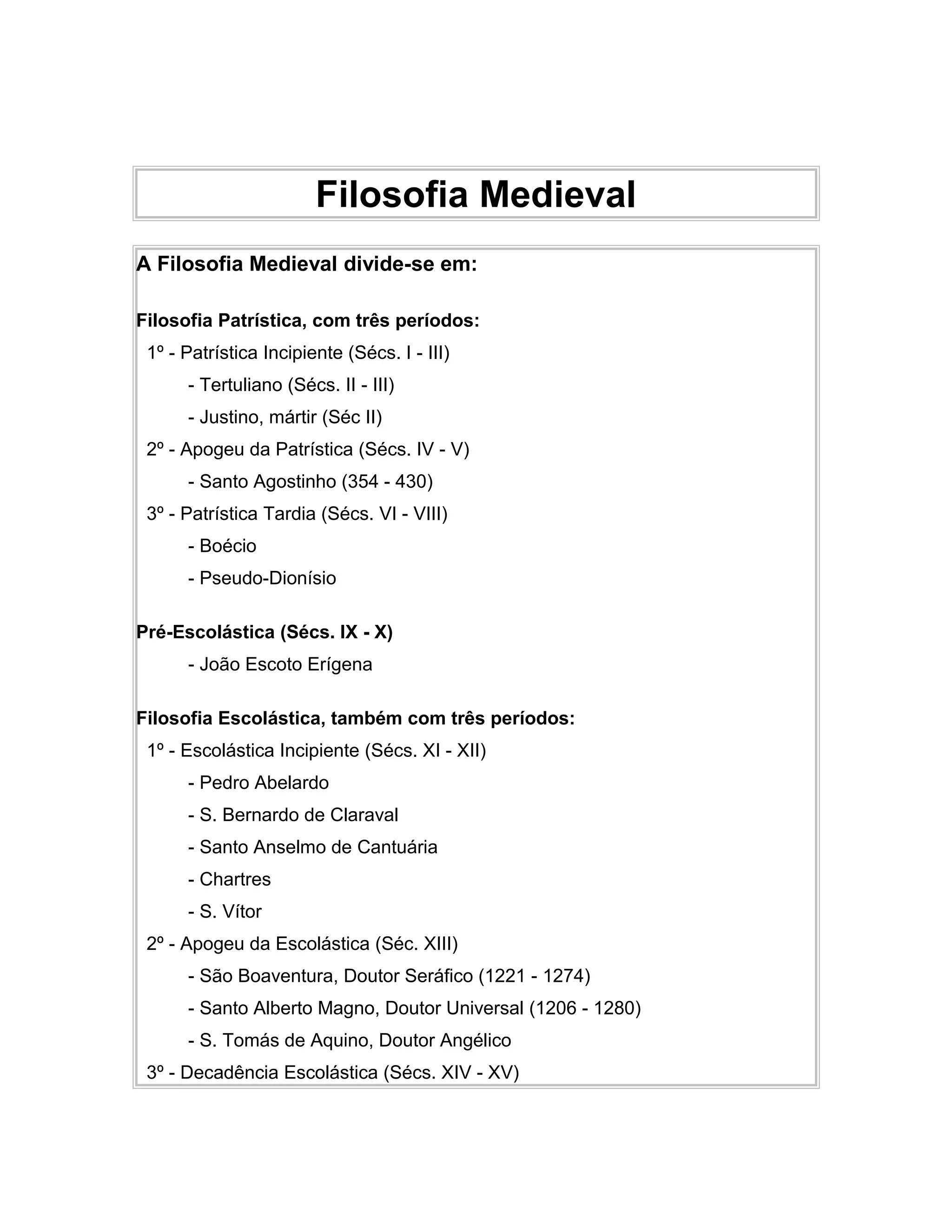 O documento resume a filosofia medieval, dividindo-a em filosofia patrística e escolástica. A patrística é dividida em três períodos e engloba pensadores como Santo Agostinho e Boécio. A escolástica também tem três períodos e inclui figuras como São Tomás de Aquino e Guilherme de Ockham. A filosofia medieval caracteriza-se pela união com a religião e busca conciliar fé e razão.