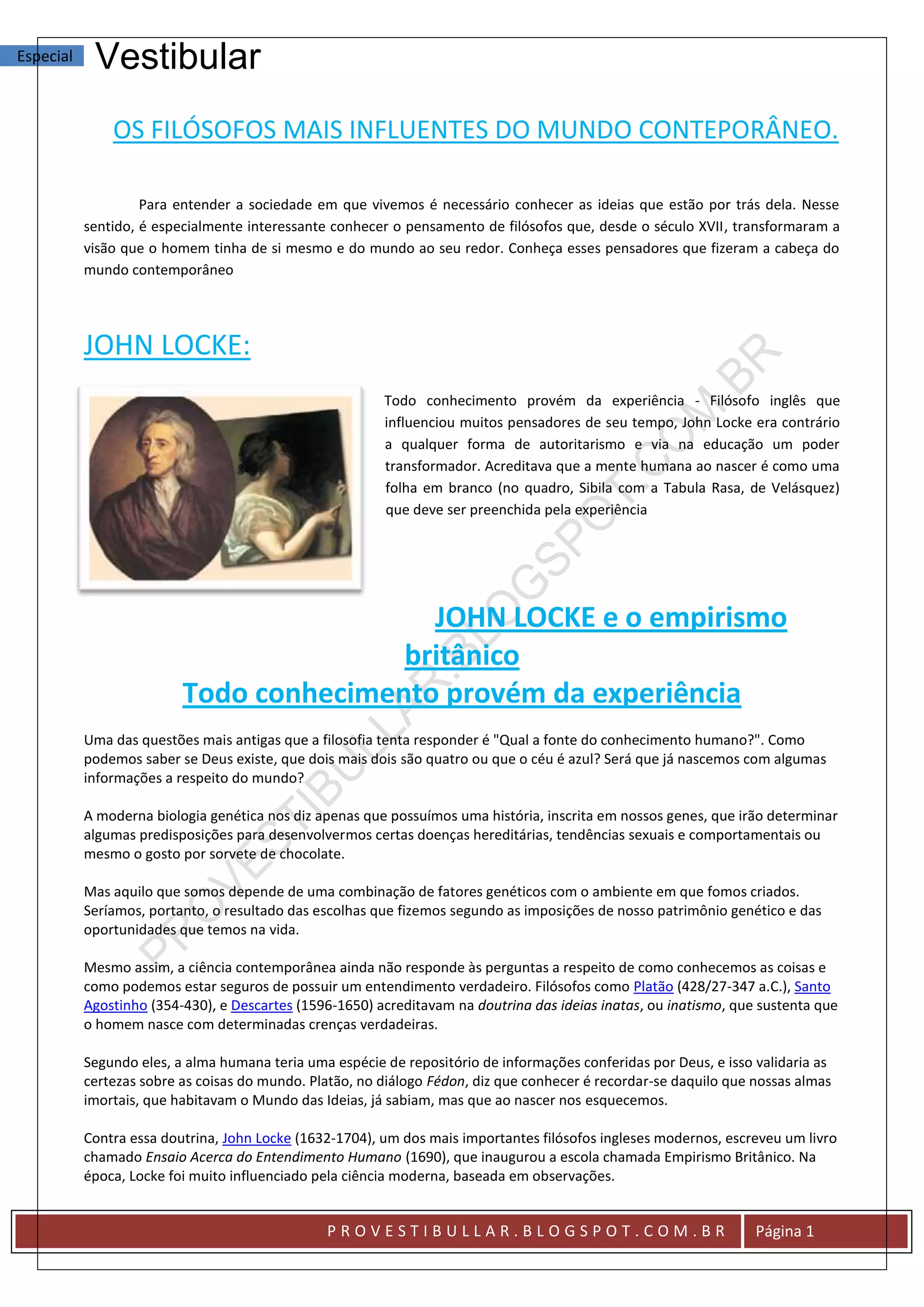 O documento discute o pensamento do filósofo John Locke e sua teoria do empirismo. De acordo com Locke, todo conhecimento provém da experiência, não de ideias inatas. A mente humana é como uma tabula rasa que é preenchida pelas ideias fornecidas pelos sentidos através da experiência. Locke argumenta que a razão também desempenha um papel no processo cognitivo, mas que a experiência é a fonte inicial de todas as ideias.