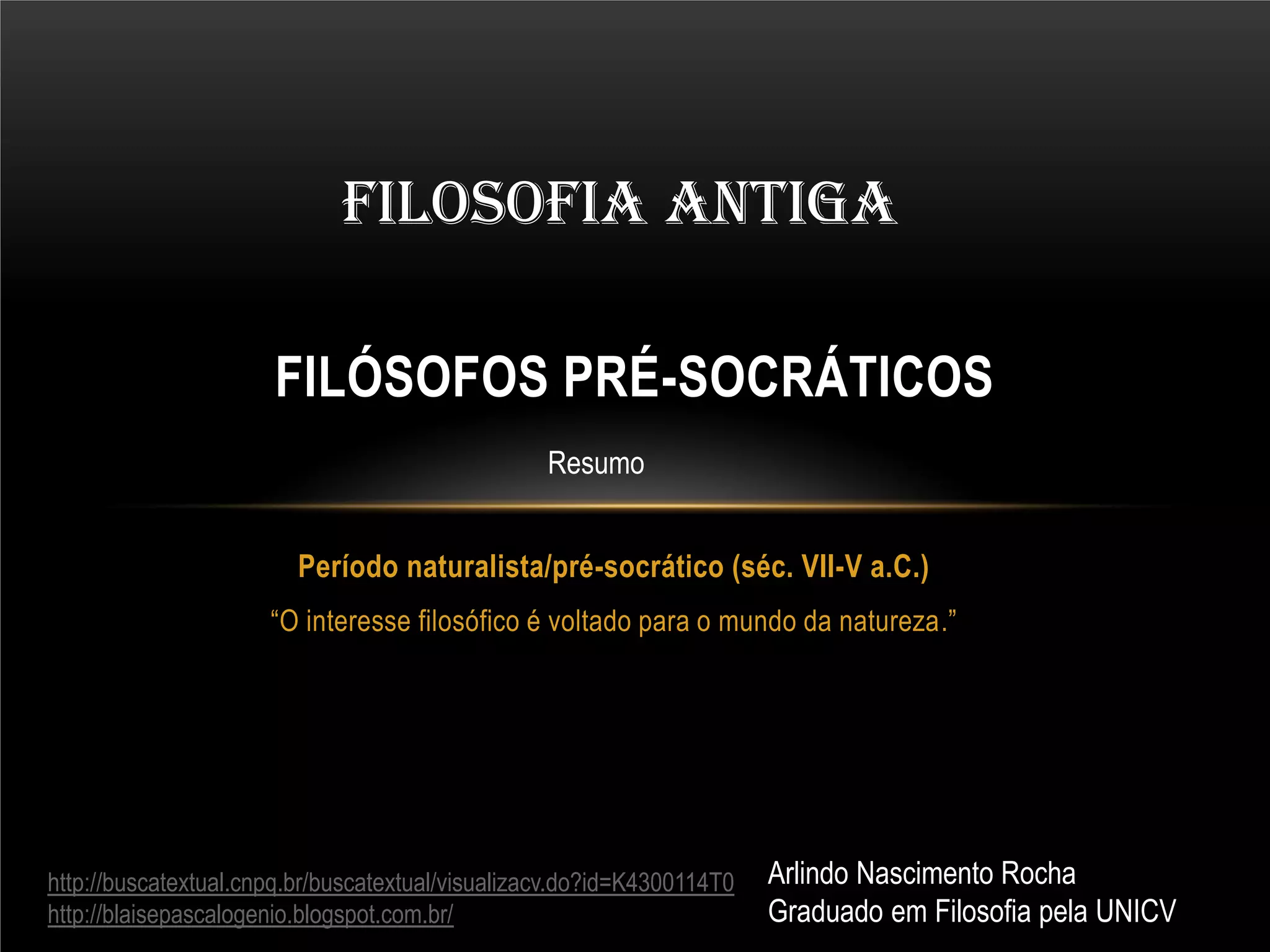 O documento resume o período pré-socrático, quando os primeiros filósofos gregos se concentraram em questões sobre a natureza. Ele descreve as principais escolas filosóficas desse período - Jônica, Pitagórica, Eleática e Atomista - e os principais filósofos como Tales, Anaximandro, Anaxímenes, Heráclito, Pitágoras, Zenão e Demócrito, além de resumir brevemente suas ideias fundamentais.