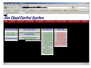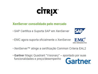 O documento discute o Xen Cloud Platform (XCP), um software livre de virtualização desenvolvido pela Citrix que permite a execução de vários sistemas operacionais simultaneamente no mesmo hardware. O XCP suporta vários sistemas operacionais e permite a gestão de máquinas virtuais em nuvens privadas ou públicas de forma híbrida. O documento demonstra como instalar e gerenciar o XCP usando o XenCenter.