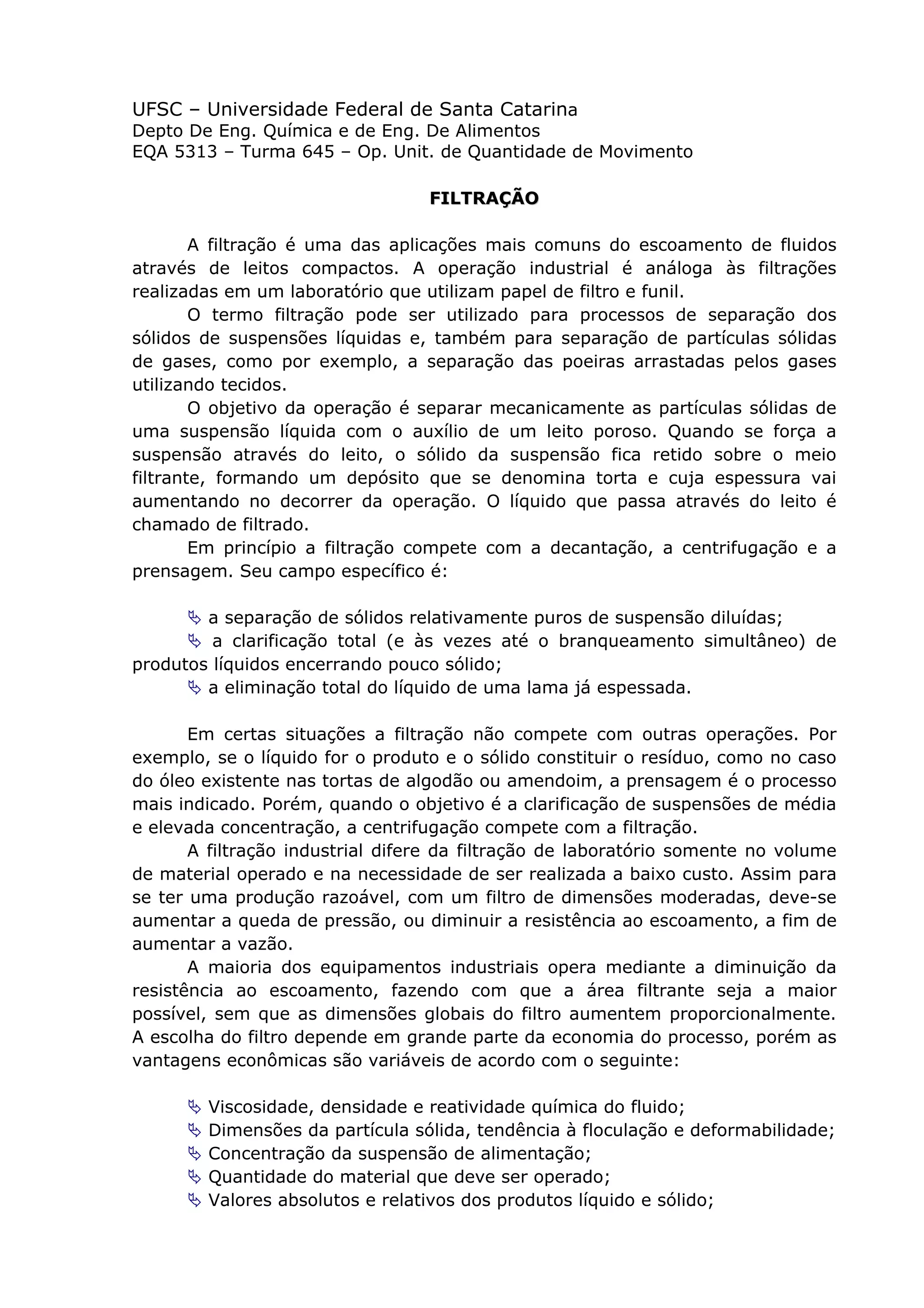 O documento descreve os principais conceitos e processos envolvidos na filtração industrial, incluindo: 1) A filtração separa mecanicamente partículas sólidas de uma suspensão líquida através de um leito poroso; 2) Existem diferentes tipos de meios filtrantes, tortas e auxiliares de filtração; 3) A escolha do equipamento depende de fatores como a natureza do fluido e sólido, concentração da suspensão e objetivos da operação.
