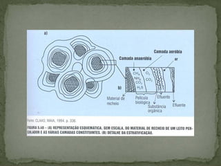O documento descreve os principais tipos de filtros biológicos para tratamento de efluentes, incluindo suas vantagens e desvantagens. É detalhado o funcionamento dos filtros de baixa, intermediária e alta taxa, assim como os principais problemas operacionais e suas soluções.
