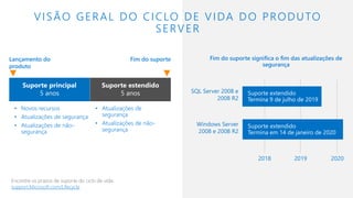 O documento aborda o fim do suporte ao Windows Server 2008 e SQL Server 2008, destacando a importância de atualizações de segurança e as oportunidades de migração para a nuvem. Ele sugere caminhos para modernizar sistemas, incluindo a migração para Azure e a adoção de versões mais recentes, como Windows Server 2016 e SQL Server 2017. O texto também menciona os benefícios de segurança, desempenho e economia ao utilizar soluções em nuvem.