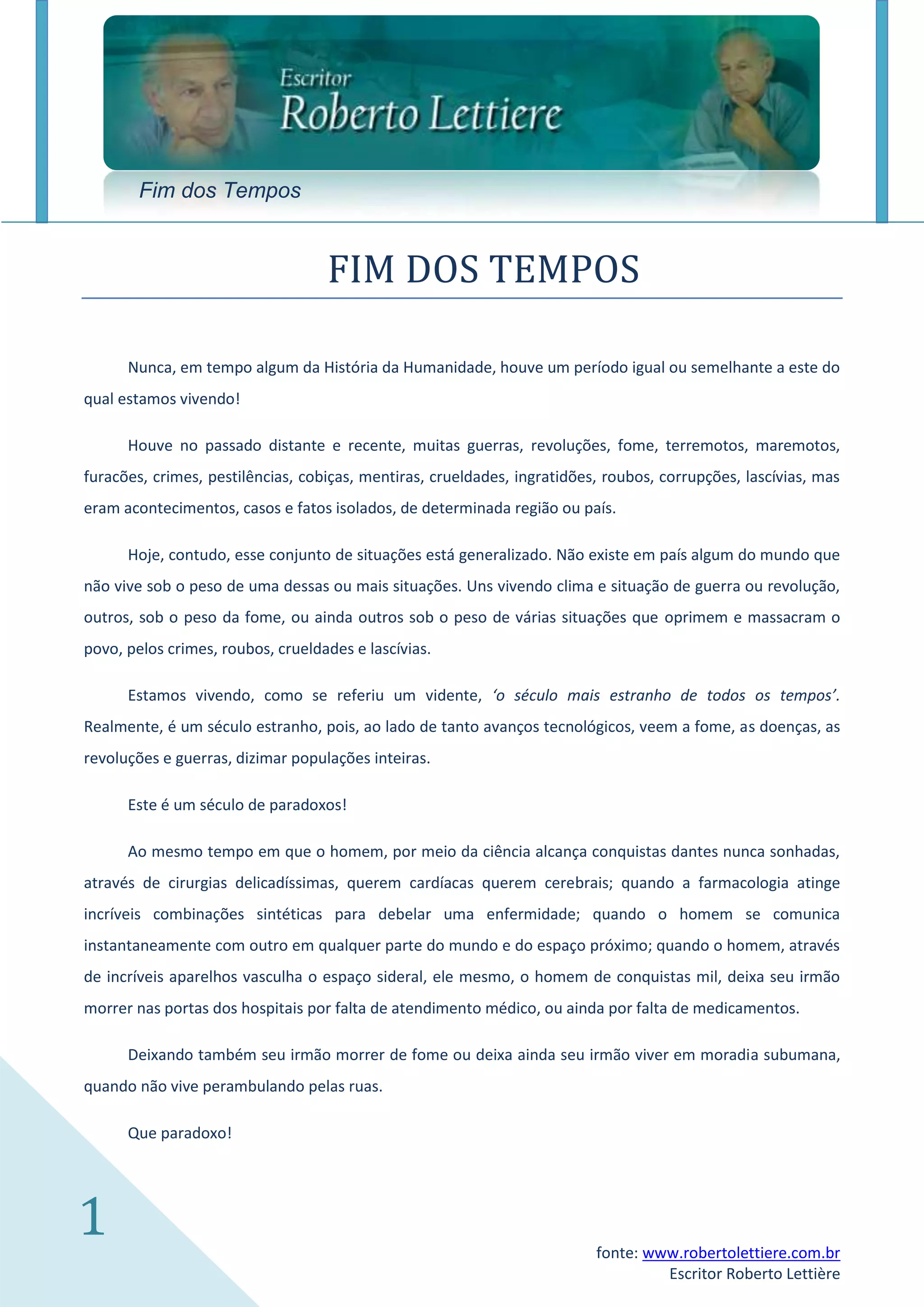 O documento discute o atual estado da humanidade, caracterizado por crises sociais, morais e geofísicas, e propõe que, apesar dos avanços tecnológicos, a sociedade enfrenta profundas desigualdades e sofrimentos. A obra reúne profecias e reflexões sobre o 'fim dos tempos', enfatizando a necessidade de transformação espiritual e moral dos indivíduos para enfrentar os desafios. O autor conclui que a verdadeira preparação deve ser interna, focando em amor e solidariedade, em vez de buscar segurança material.