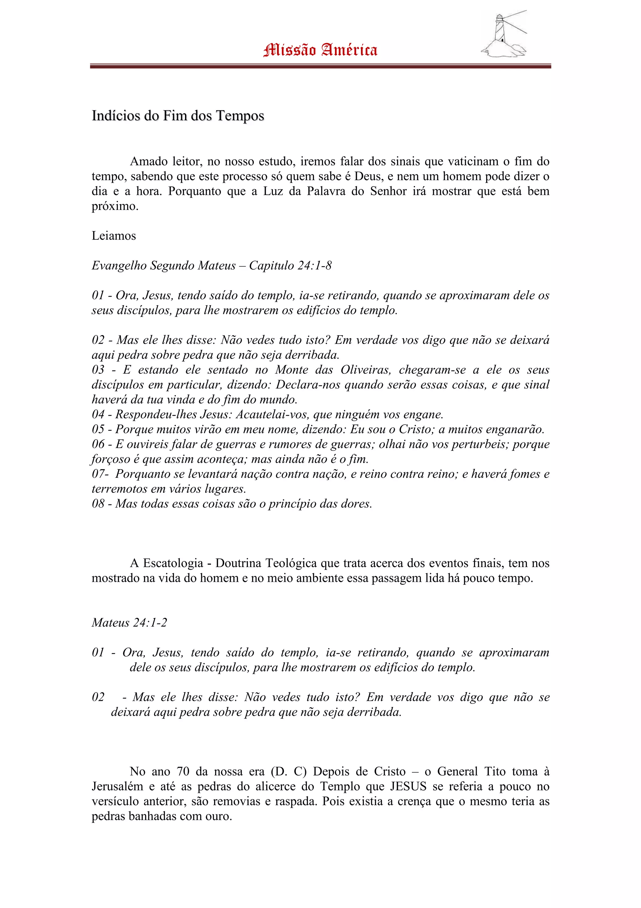 [1] O documento discute sinais bíblicos dos tempos finais, incluindo guerras, desastres naturais, epidemias e falsos profetas citando passagens do Evangelho de Mateus. [2] Ele também menciona eventos históricos como a destruição do Templo de Jerusalém e o tsunami de 2004 como cumprindo profecias. [3] Por fim, adverte sobre uma possível pandemia de gripe que pode matar 100 milhões, indicando que a volta de Cristo está próxima.