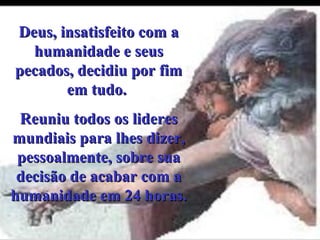 Deus informa aos líderes mundiais que a humanidade será destruída em 24 horas devido aos seus pecados. Os líderes reagem de diferentes maneiras ao anúncio, cada um transmitindo a notícia ao seu povo com diferentes interpretações. A reunião revela as crenças e promessas de cada líder em momentos de crise.