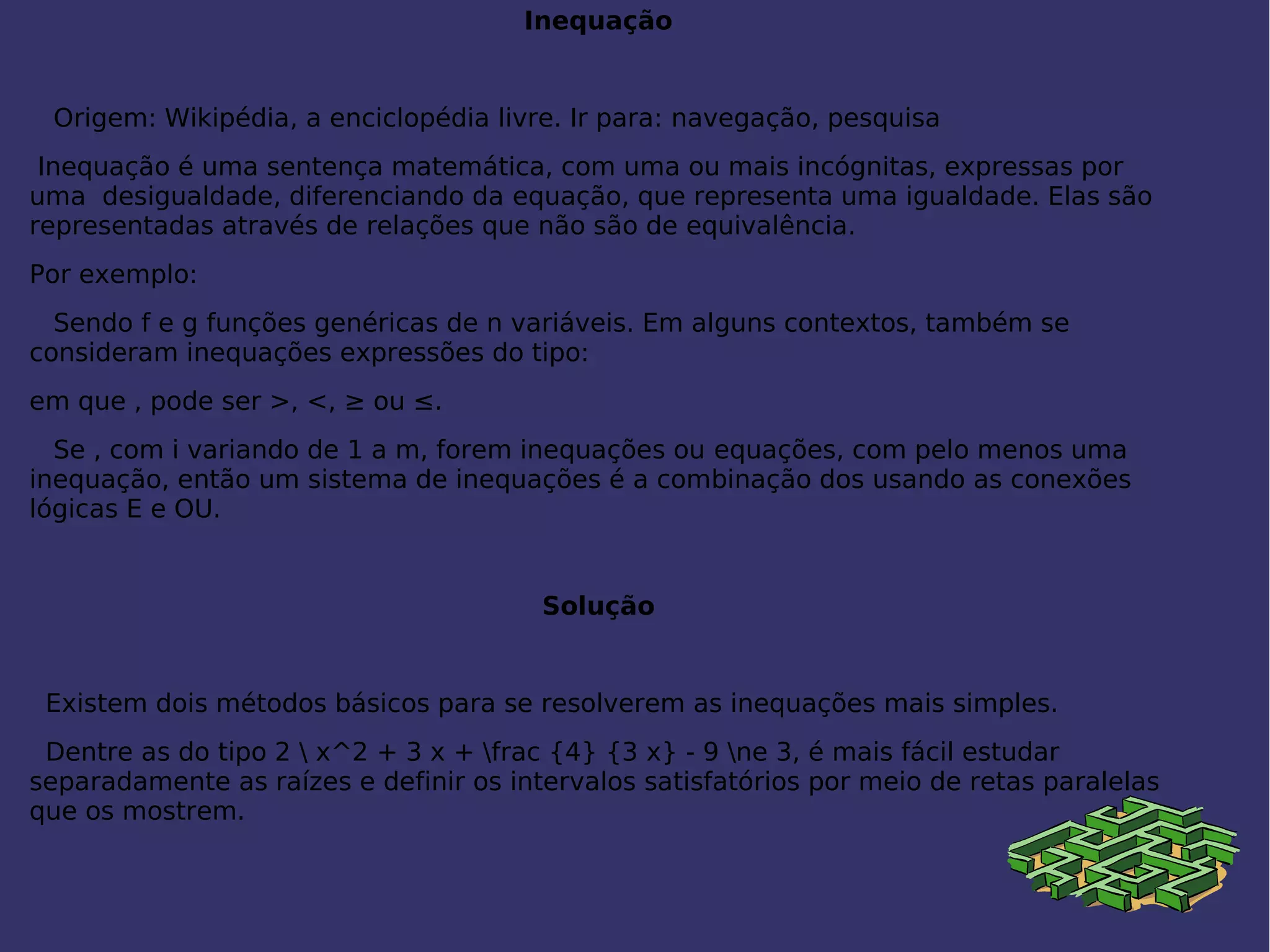 Inequação é uma sentença matemática expressa por uma desigualdade, diferente de uma equação que representa uma igualdade. Existem dois métodos para resolver inequações simples, como estudar separadamente as raízes ou usar interseções com hipérboles. Sistemas de inequações envolvem combinações de inequações e equações usando conexões lógicas.