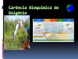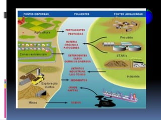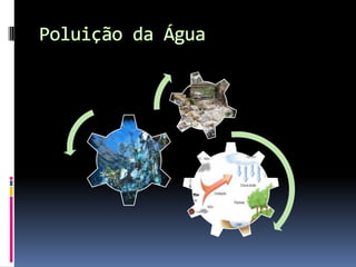 Este documento descreve os principais tipos de poluição ambiental, incluindo a poluição atmosférica, do solo e da água. Detalha os poluentes associados a cada tipo de poluição, suas causas e efeitos na saúde humana e no meio ambiente.