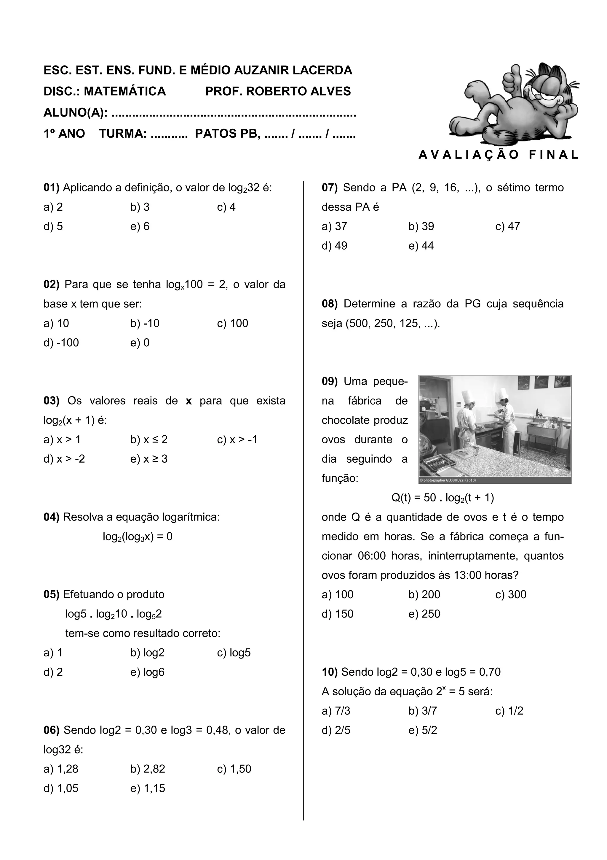01) Aplicando a definição, o valor de log232 é: 07) Sendo a PA (2, 9, 16, ...), o sétimo termo