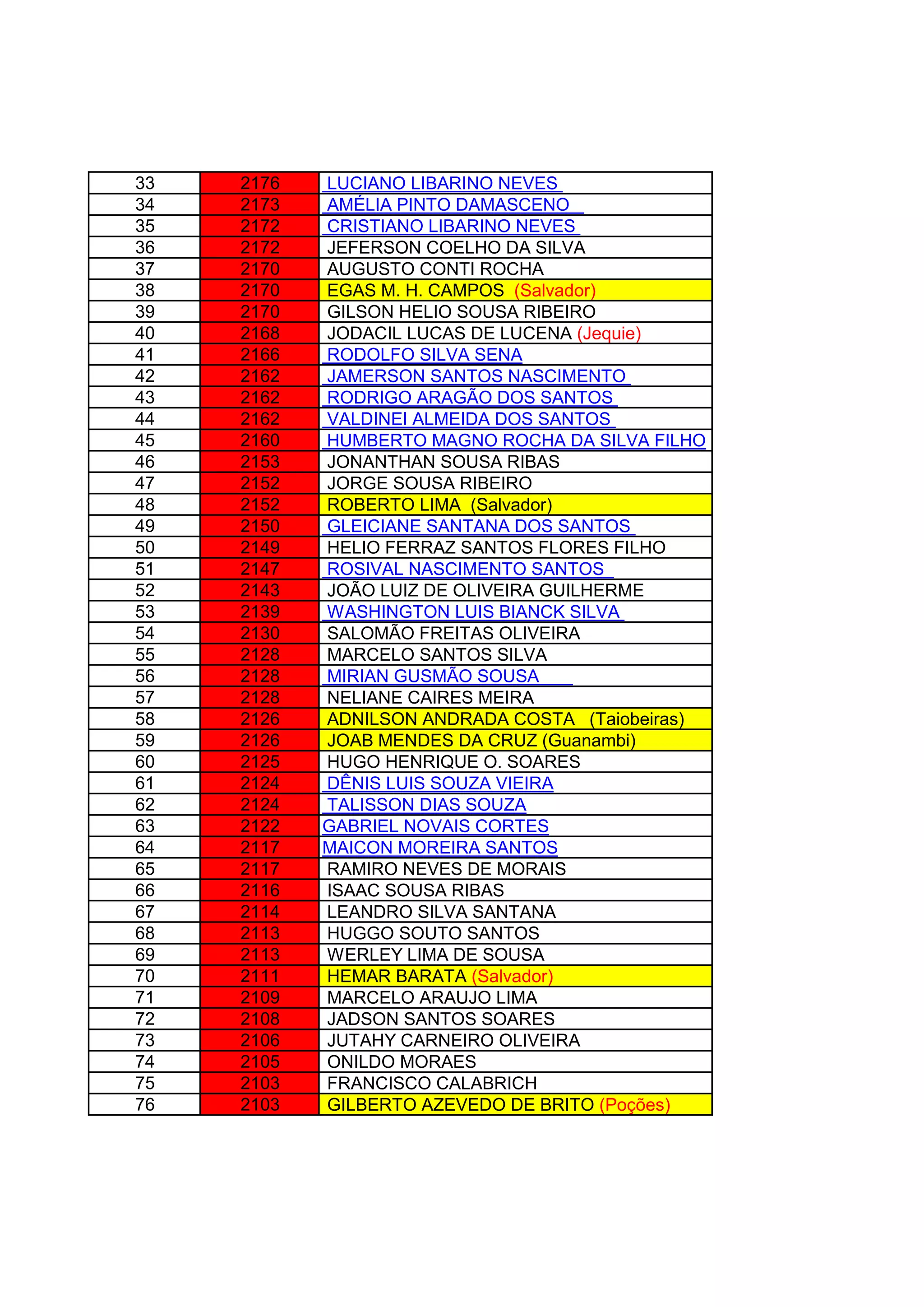 1) A lista classifica jogadores de xadrez pelo seu rating, indo de Pedro Santos Ferreira em 1o lugar com 2454 pontos até Ivan da em 250o com 2030 pontos.