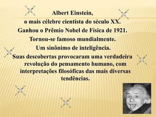 Albert Einstein foi um dos cientistas mais importantes do século XX, ganhando o Prêmio Nobel de Física em 1921 por suas descobertas revolucionárias que mudaram profundamente a compreensão humana sobre o universo. Suas teorias provocaram interpretações filosóficas em diversas áreas e ele se tornou sinônimo de inteligência em todo o mundo.