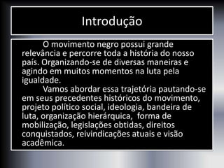 O documento descreve a história e as características principais do movimento negro no Brasil. O movimento surgiu para lutar contra o tratamento desumano dos escravos e buscar igualdade racial. Ao longo do tempo, o movimento obteve leis contra o racismo e a discriminação racial e conquistou direitos como a inclusão da história e cultura negra nos currículos escolares. Atualmente, a principal reivindicação do movimento é a reparação histórica pelos danos causados pela escravidão.