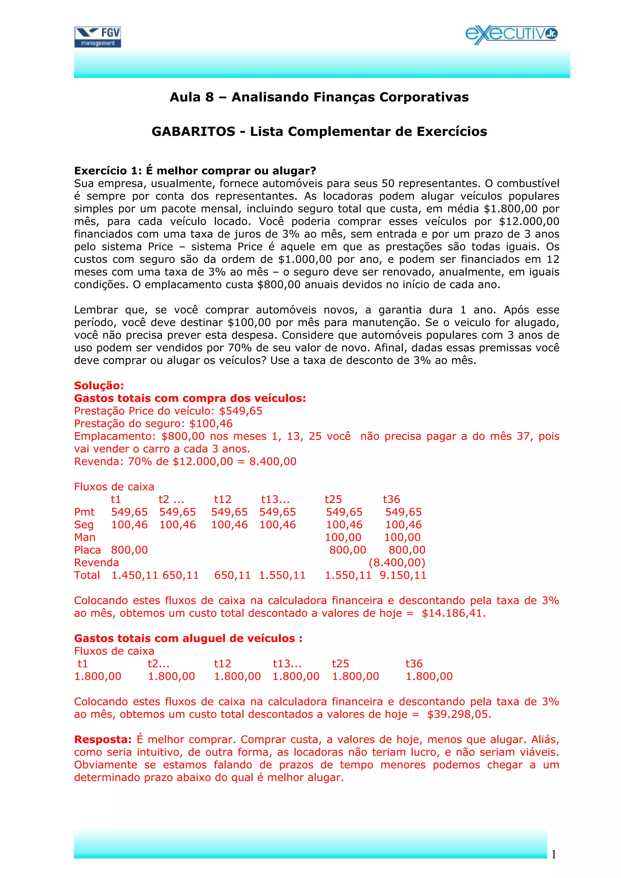 O documento apresenta 5 exercícios sobre finanças corporativas. O primeiro exercício analisa se é melhor comprar ou alugar veículos para representantes de uma empresa, considerando os custos envolvidos. O segundo exercício avalia se é melhor pagar à vista ou financiar a compra de um automóvel. O terceiro exercício considera se vale a pena fazer uma reforma em um escritório alugado antes de se mudar para um novo. O quarto exercício analisa a viabilidade de um negócio perpétuo. E o quinto exercício calcula o tempo