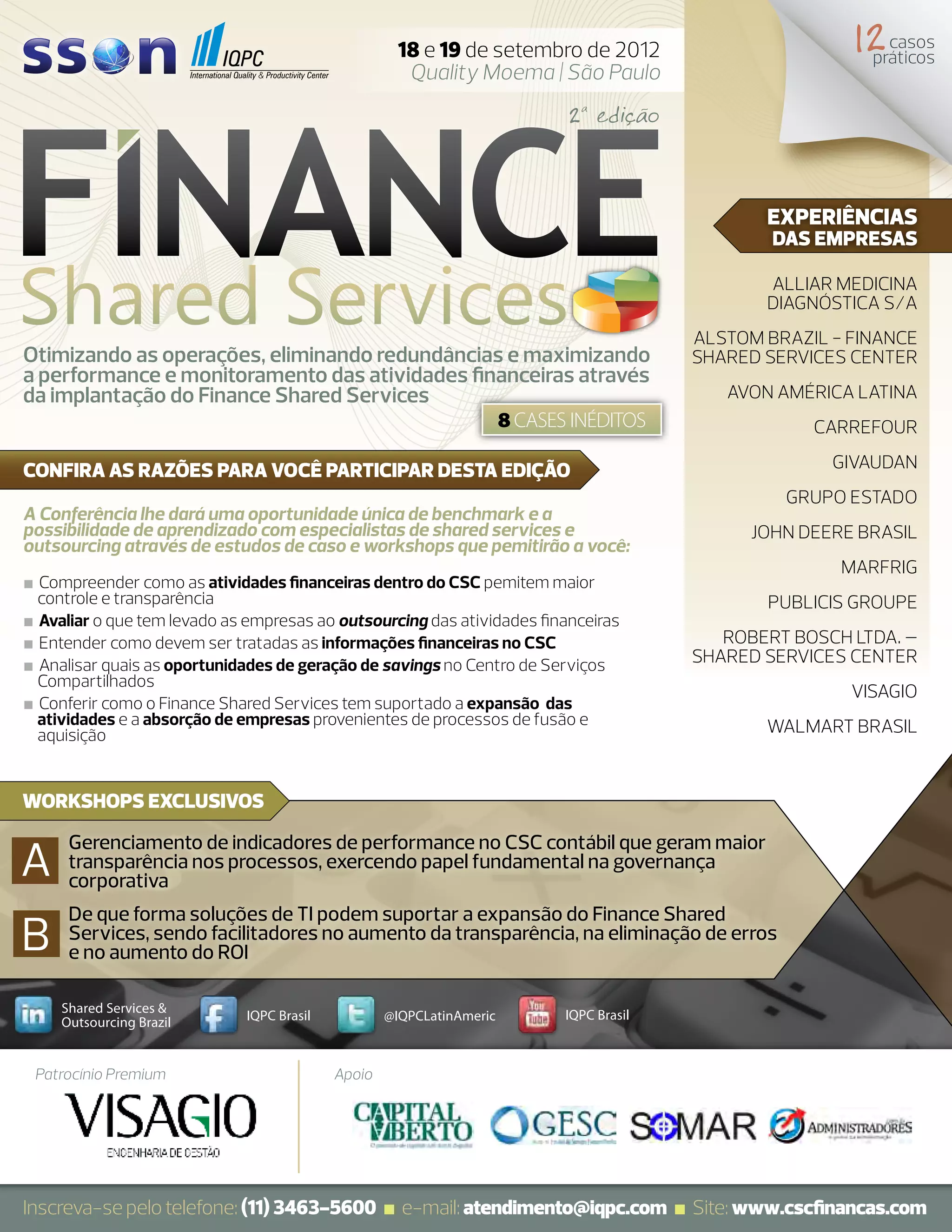 O evento 'Finance Shared Services' ocorrerá em São Paulo nos dias 18 e 19 de setembro de 2012, reunindo especialistas e empresas para discutir otimização de operações financeiras e compartilhamento de serviços. A conferência abordará tópicos como governança corporativa, transparência e outsourcing, com base em estudos de caso práticos de empresas renomadas. O IQPC, organizador do evento, oferece oportunidades de networking e aprendizado sobre melhores práticas em serviços compartilhados para executivos da área.