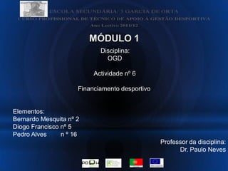Este documento descreve seis medidas de financiamento desportivo em Portugal, incluindo: 1) melhorar a saúde e segurança em instalações desportivas, 2) construir campos de relva sintética, 3) modernizar federações desportivas, 4) construir mini-campos desportivos, 5) apoiar clubes históricos, e 6) desenvolver centros de alto rendimento. Cada medida tem artigos descrevendo objetivos, elegibilidade, candidaturas e comparticipações financeiras.