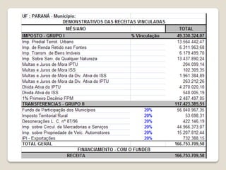 O documento descreve os principais marcos legais e aspectos do financiamento da educação no Brasil, incluindo a constituição federal, o FUNDEB e a distribuição de recursos entre os entes federados. O FUNDEB é o principal mecanismo de financiamento da educação básica pública no país, reunindo 20% dos impostos estaduais e municipais e contando com um complemento da União para estados com valor por aluno abaixo da média nacional.