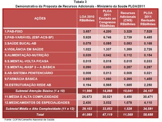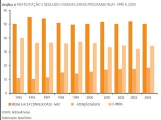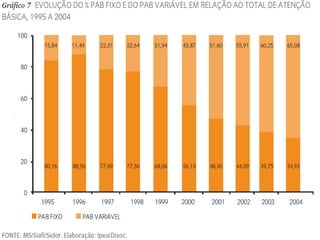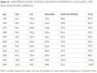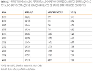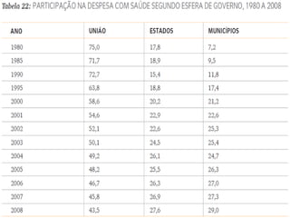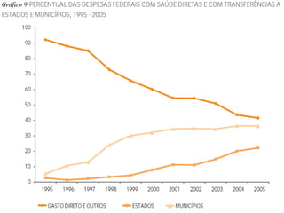 O documento discute a história e os mecanismos de financiamento do Sistema Único de Saúde brasileiro. Ele descreve os períodos de financiamento desde os auxílios mútuos até a criação do SUS pela Constituição de 1988 e posterior regulamentação. Também aborda a Emenda Constitucional 29 de 2000 que estabeleceu percentuais mínimos de gastos com saúde para União, estados e municípios.