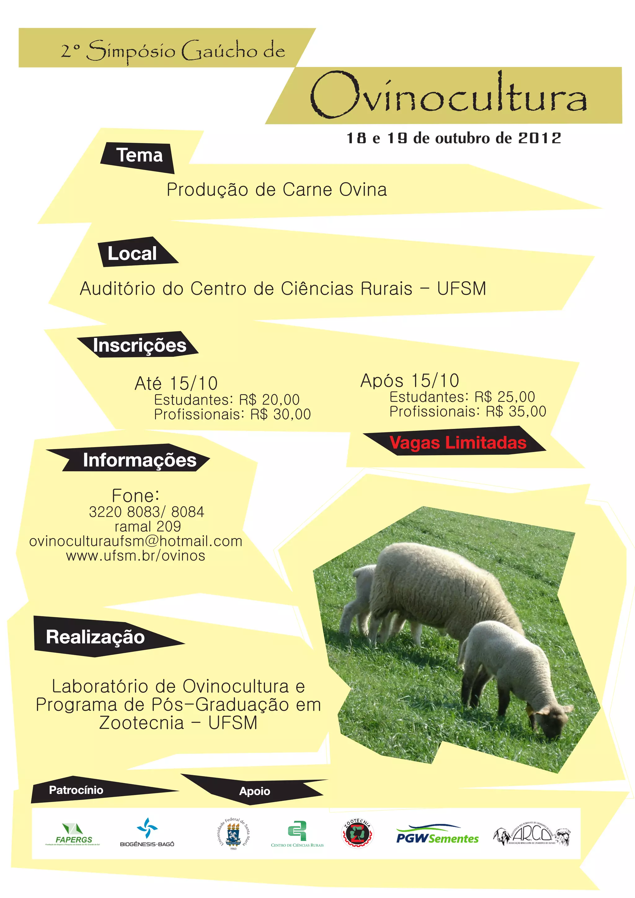 O 2° Simpósio Gaúcho de Ovinocultura irá ocorrer nos dias 18 e 19 de outubro de 2012 no Auditório do Centro de Ciências Rurais da UFSM, com o tema "Produção de Carne Ovina". As inscrições podem ser feitas até o dia 15/10 a preços promocionais e após essa data a valores maiores, com vagas limitadas. O evento é realizado pelo Laboratório de Ovinocultura e Programa de Pós-Graduação em Zootecnia da UFSM.