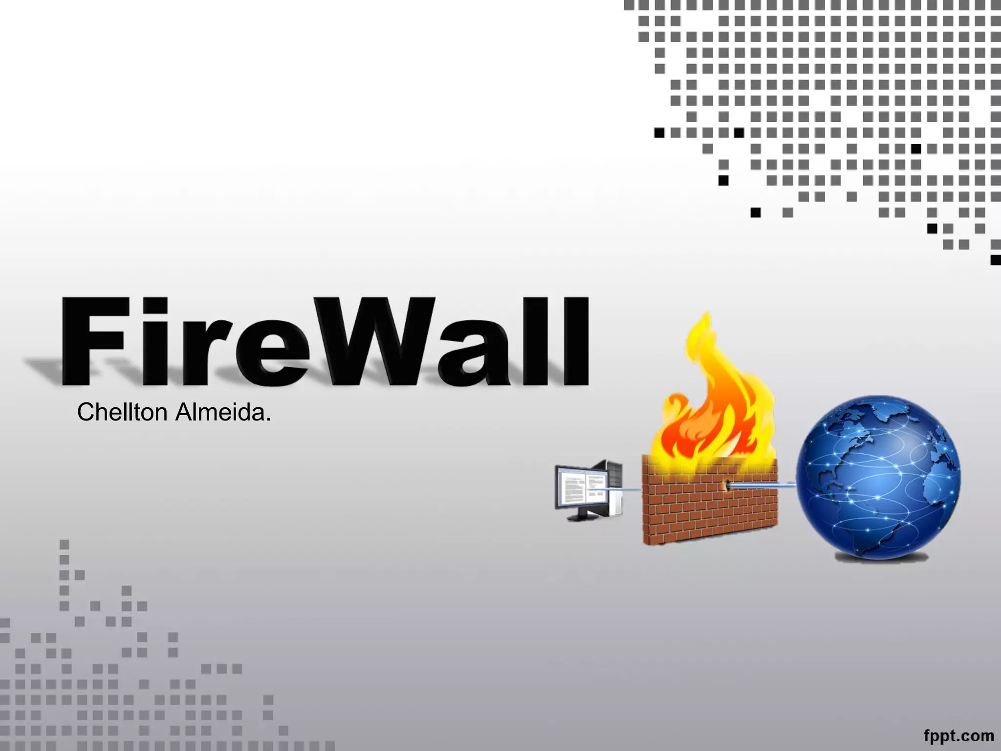 O documento descreve o que é um firewall, como funciona e seus principais tipos. Um firewall é um ponto entre redes que controla e registra todo o tráfego, protegendo redes confiáveis de redes públicas. Existem dois principais tipos: filtragem de pacotes e controle de aplicação. A arquitetura de rede também é explicada, incluindo dual-homed host, screened host e screened subnet.