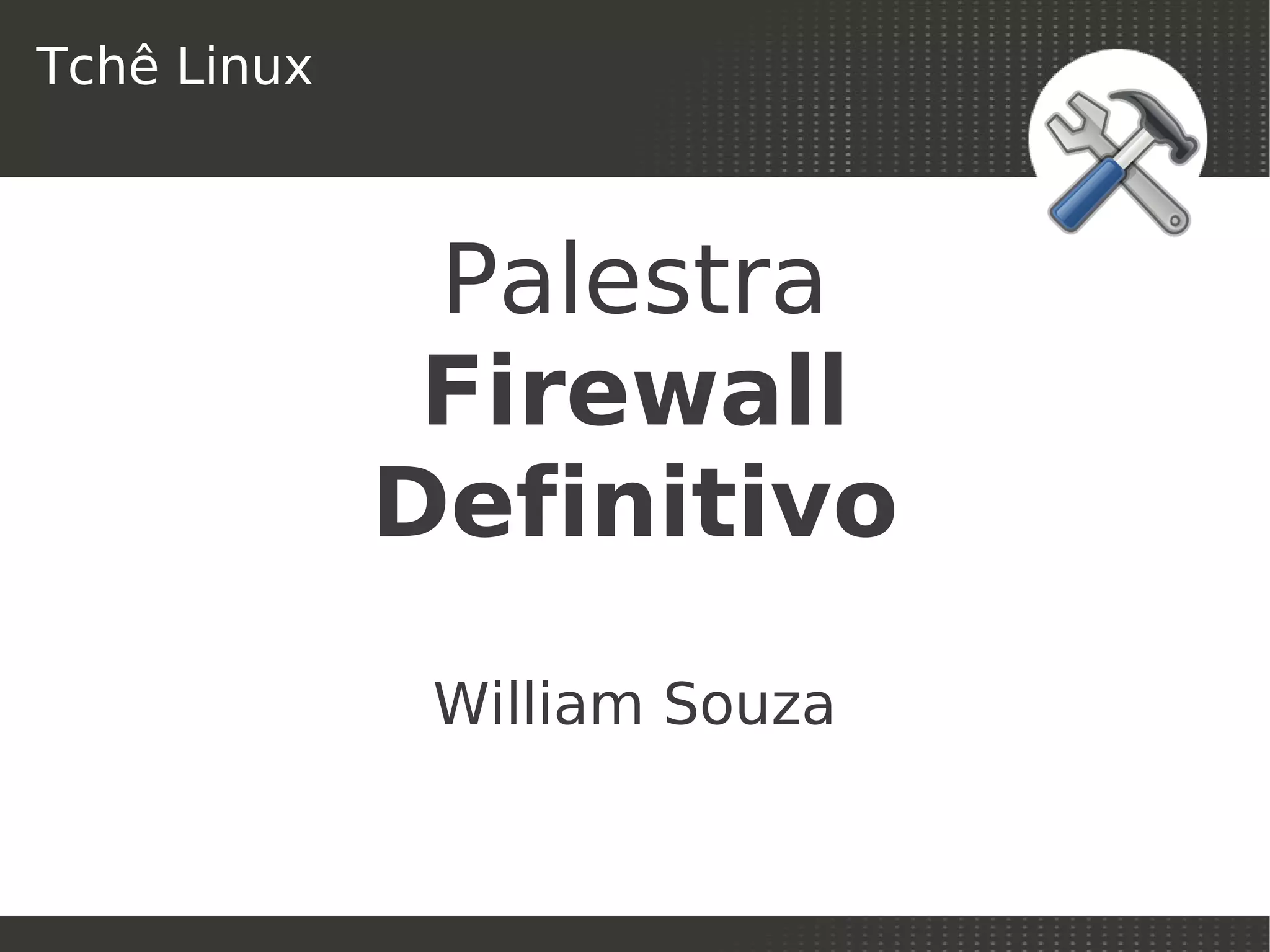 [1] O documento apresenta uma palestra sobre o firewall Fyrewall, incluindo download, instalação em máquina virtual e configuração. [2] É explicado como configurar o nome do servidor, domínio, endereçamento DNS, NTP, placas de rede WAN e LAN e senha do administrador. [3] Também são mostrados procedimentos de segurança como alterar o protocolo de acesso para HTTPS e porta personalizada, criar regras NAT e habilitar o serviço SSH.