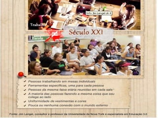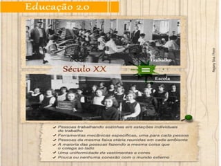O documento discute como as demandas do mercado de trabalho do século 21 exigem trabalhadores multitarefas e qualificados. Isso requer mudanças na educação para desenvolver novas competências por meio de novas tecnologias e configurações de aprendizagem que aproximem a escola do mundo real. A educação deve preparar os estudantes para resolver problemas complexos e colaborar em um ambiente multidisciplinar.