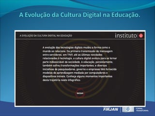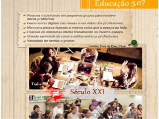 O documento discute como o mercado de trabalho e a educação estão se adaptando às novas demandas da era digital. A educação precisa se preparar para ensinar competências multidisciplinares e habilidades de resolução de problemas para atender às necessidades das indústrias e carreiras do século 21. A tecnologia está transformando como aprendemos, permitindo novas formas de aprendizado colaborativo e contextualizado fora da sala de aula tradicional.