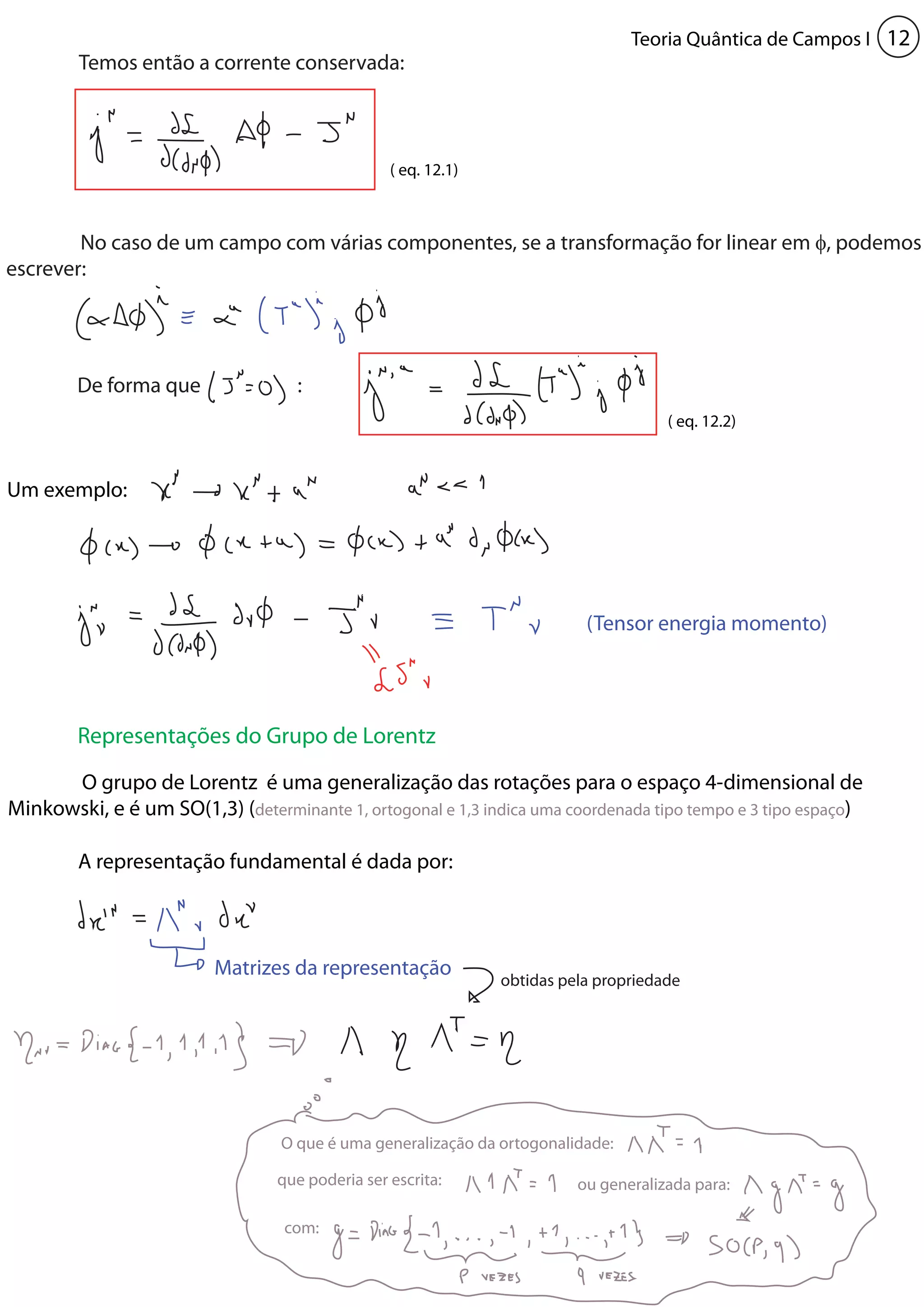 1) O documento discute a teoria quântica de campos, incluindo representações do grupo de Lorentz e quantização canônica.
