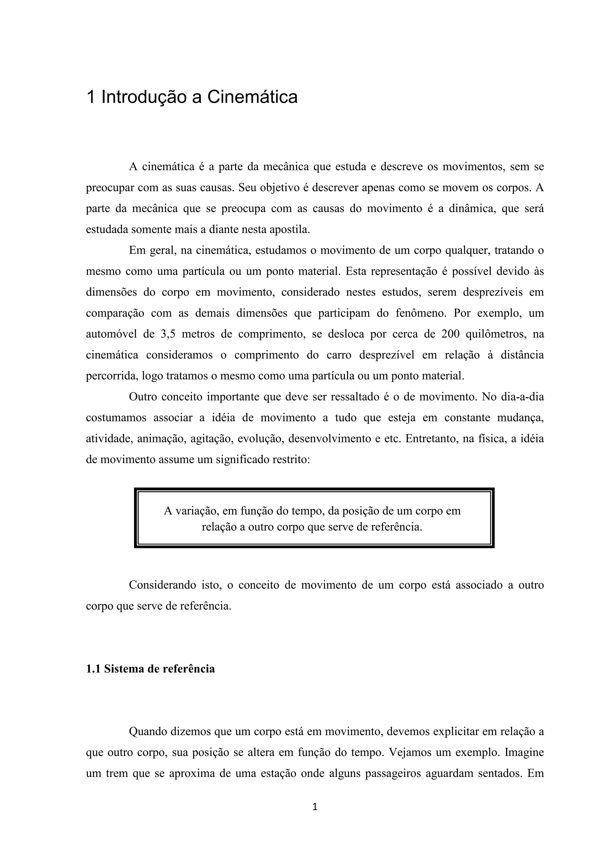O documento apresenta uma introdução à cinemática, definindo seus principais conceitos como movimento, referencial, deslocamento, velocidade média e instantânea. Explica o movimento retilíneo uniforme (MRU) através da equação horária e como interpretar seus gráficos de espaço-tempo e velocidade-tempo.