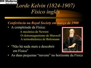1) O documento discute o desenvolvimento da física no século XX, desde a visão de que a física estava completa até o surgimento da física quântica.