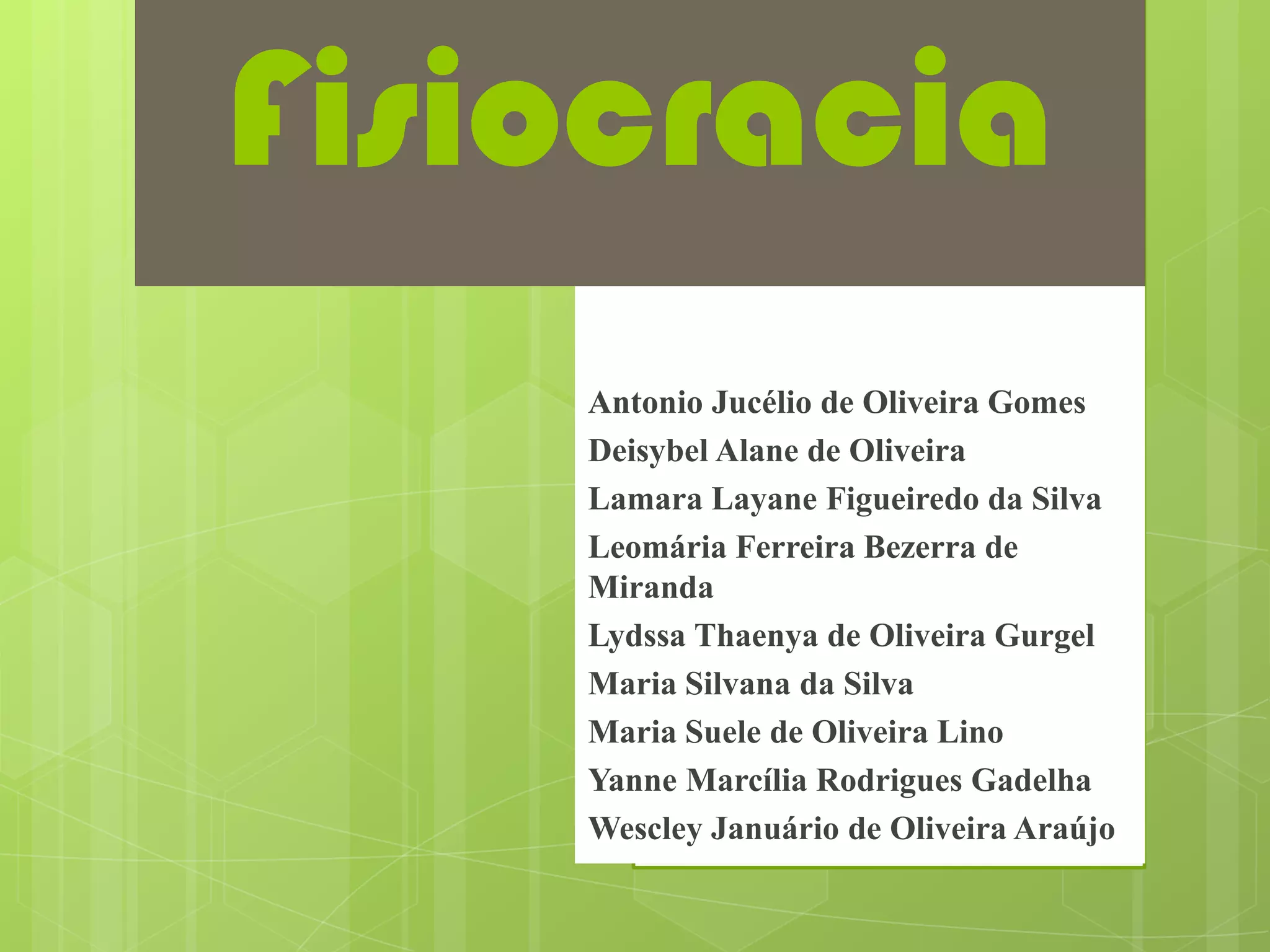 Este documento resume a escola econômica francesa do século 18 conhecida como Fisiocracia. Apresenta os principais representantes como François Quesnay, Anne Robert Jacques Turgot e Pierre Samuel du Pont de Nemours. Discutem conceitos-chave como a noção de ordem natural e providencial e como isso se aplicava à economia e política da época, defendendo a liberdade econômica e a propriedade privada.