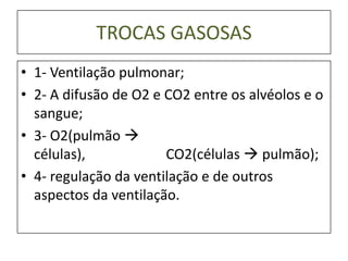 O documento descreve as trocas gasosas nos pulmões, incluindo a ventilação pulmonar, a difusão de oxigênio e gás carbônico entre os alvéolos e o sangue, e a regulação da ventilação. Também discute os músculos respiratórios e seus papéis na inspiração e expiração, além dos volumes pulmonares e capacidades envolvidas no processo respiratório.