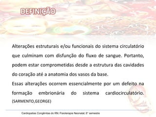 O documento aborda as cardiopatias congênitas, destacando suas causas, sintomas e tratamentos, especialmente no contexto do recém-nascido. A fisioterapia desempenha um papel crucial no manejo pré e pós-operatório dessas condições, buscando estabilizar a função respiratória e evitar complicações. Além disso, enfatiza a importância do diagnóstico precoce e intervenção cirúrgica para melhorar a qualidade de vida dos pacientes.
