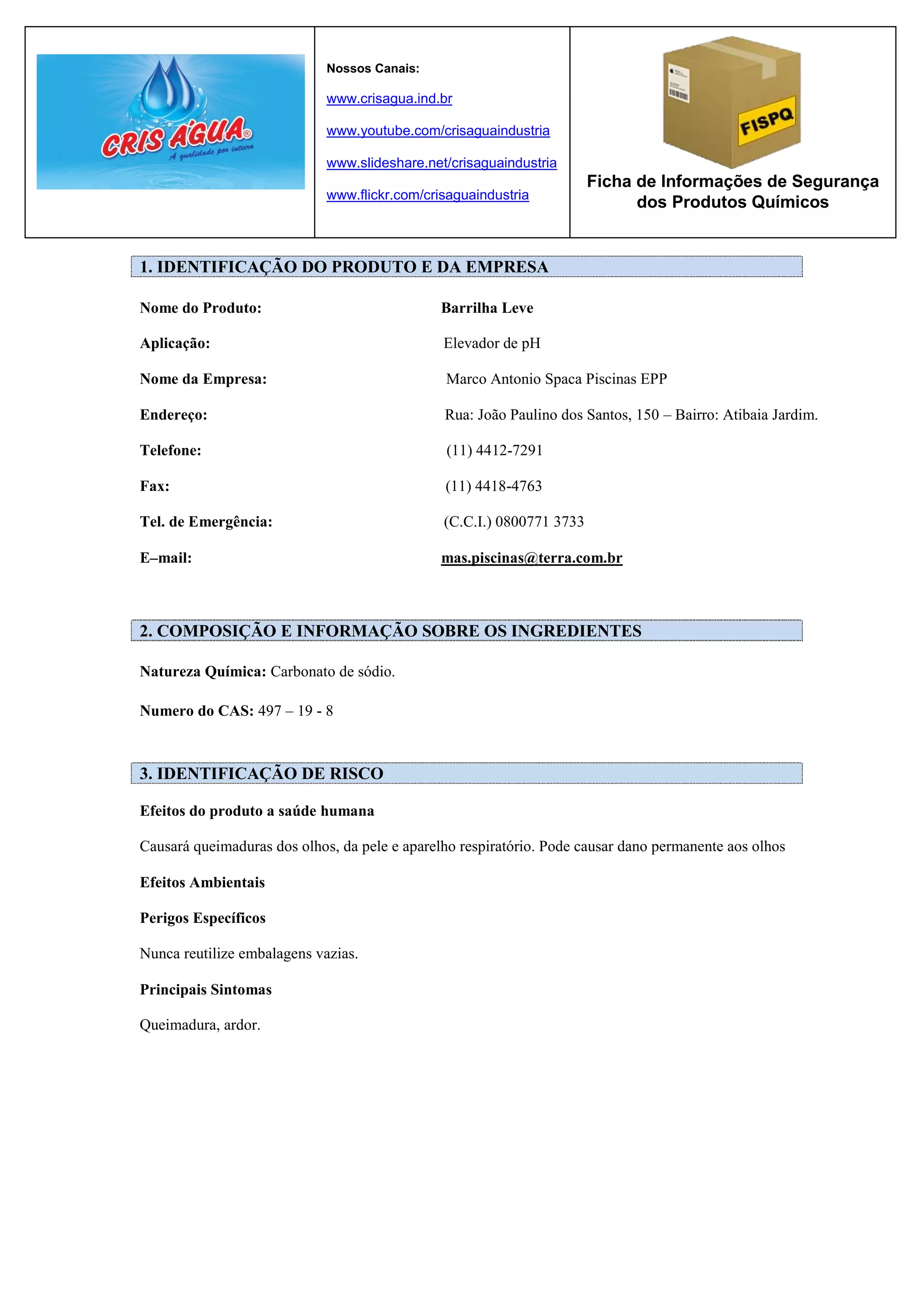 Este documento fornece informações de segurança sobre o produto químico Barrilha Leve produzido pela empresa Marco Antonio Spaca Piscinas EPP. Ele descreve os riscos à saúde humana e ao meio ambiente, medidas de primeiros socorros, controle de exposição, propriedades físico-químicas, estabilidade, informações toxicológicas, considerações sobre descarte, regulamentações e outras informações relevantes.