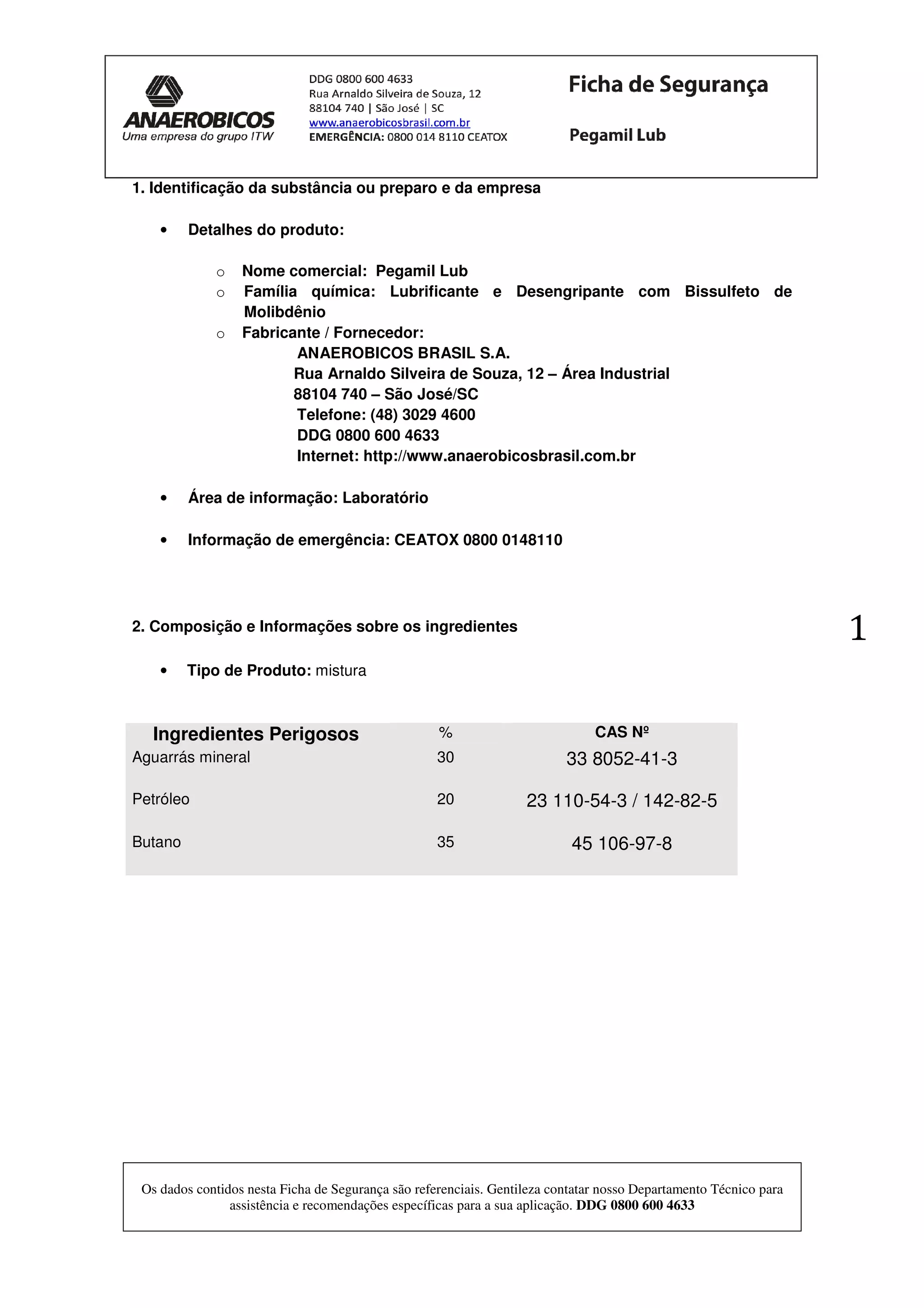 Este documento fornece informações sobre um lubrificante chamado Pegamil Lub, incluindo sua composição química, propriedades, medidas de segurança e transporte. Contém instruções sobre primeiros socorros em caso de exposição e medidas para manuseio, armazenamento e descarte seguros.