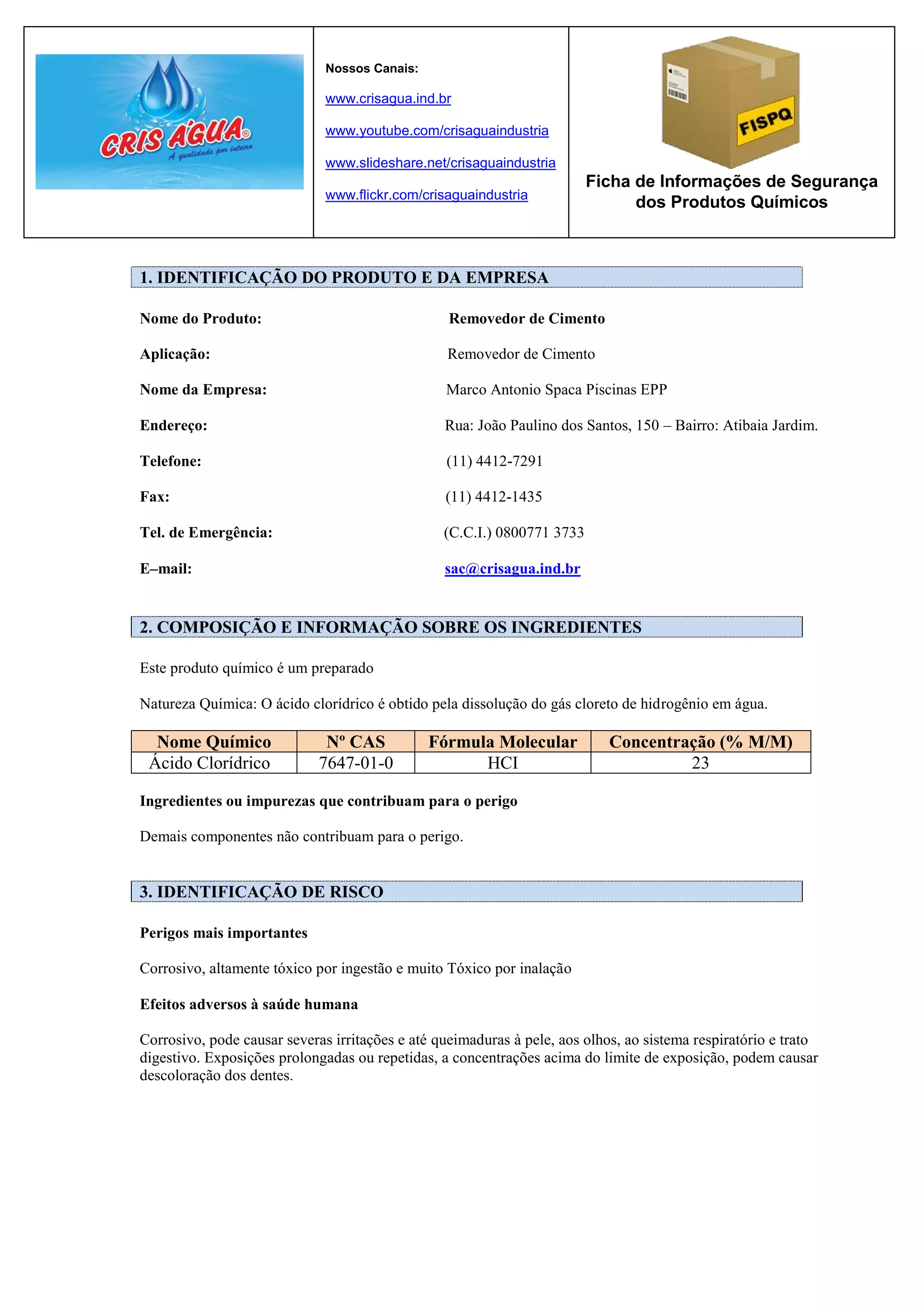 Este documento fornece informações de segurança sobre um produto químico chamado Removedor de Cimento. Ele contém ácido clorídrico que é corrosivo e tóxico se inalado ou ingerido. O documento descreve os riscos à saúde humana e ao meio ambiente, além de fornecer instruções sobre primeiros socorros, combate a incêndios, controle de exposição e armazenamento seguro.