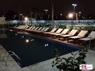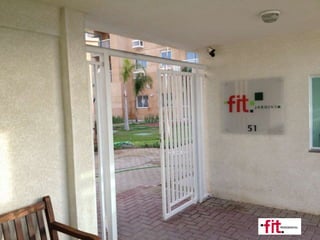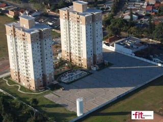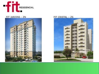 O documento descreve duas residências, FIT Jardins e FIT Cristal. FIT Jardins tem 2 torres com 14 andares e 172 unidades, enquanto FIT Cristal tem 4 torres com 5-8 andares e 154 unidades. Ambas contam com diferentes opções de dormitórios, vagas de garagem, elevadores e sistemas de aquecimento de água.