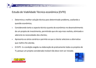 O documento discute conceitos financeiros importantes para projetos de TI, como modelagem financeira, fluxo de caixa, análise de sensibilidade, cenários, taxa de retorno e validação de modelos. Apresenta exemplos de como aplicar esses conceitos na prática de projetos.