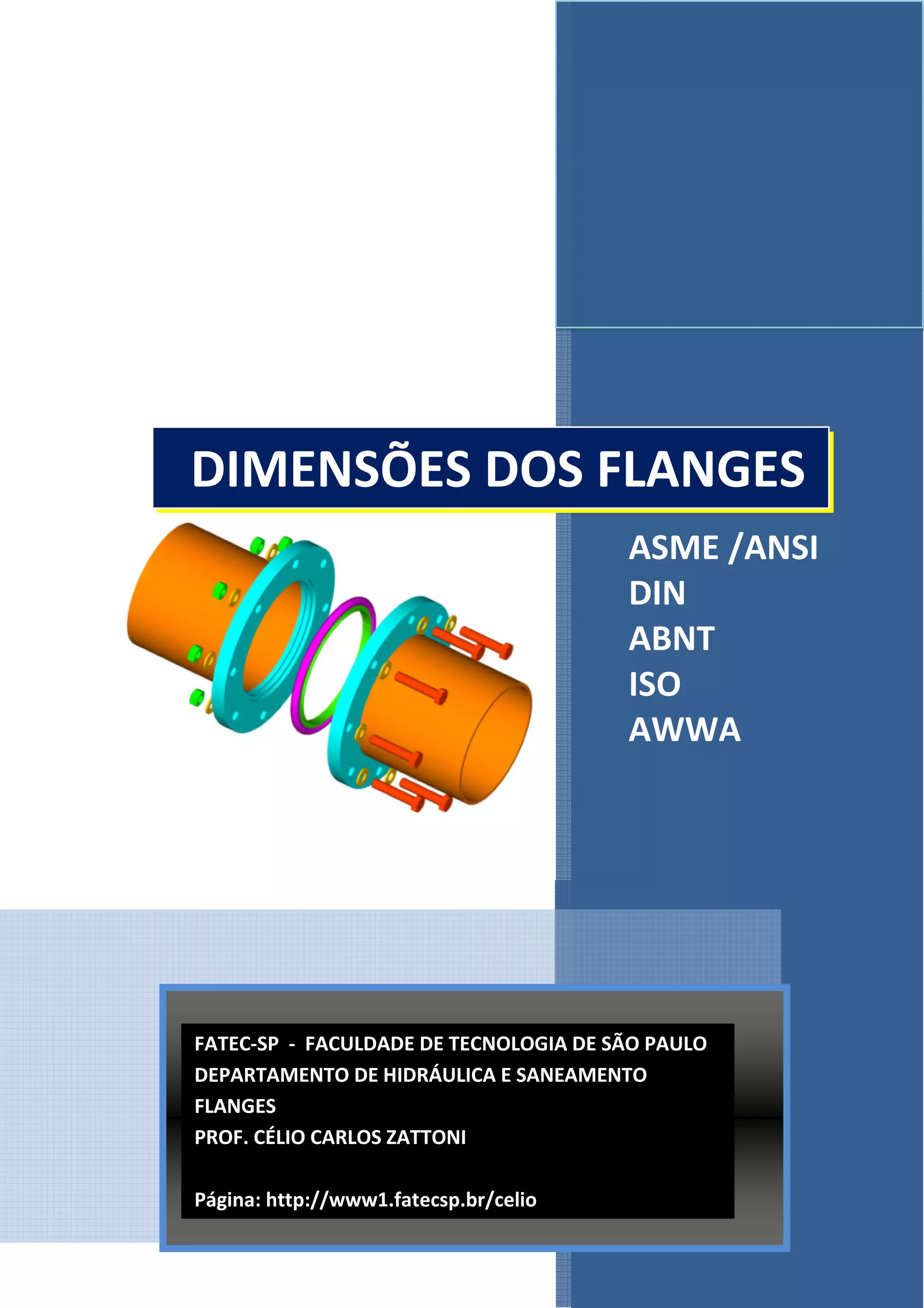 1. O documento apresenta tabelas com as dimensões de flanges de acordo com padrões ASME/ANSI, DIN, ABNT, ISO e AWWA.